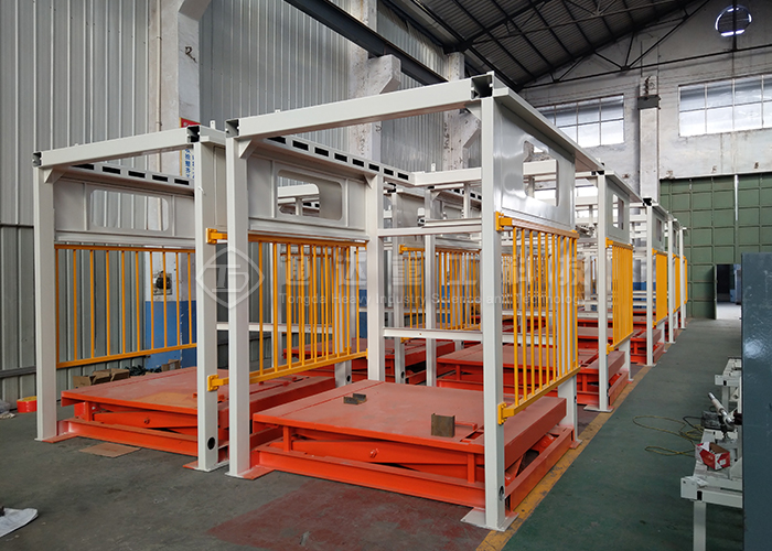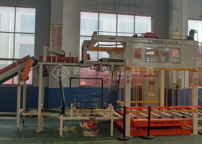 高位機械手碼垛機的工作原理是平板上工件符合棧板要求的一層工件,平板及工件向前移動直至棧板垂直面。上方擋料桿下降,另三方定位擋桿起動夾緊,此時平板復位。各工件下降到棧板平面,棧板平面與平板底面相距10mm,棧板下降一個工件高度。往復上述直到棧板堆碼達到設(shè)定要求。